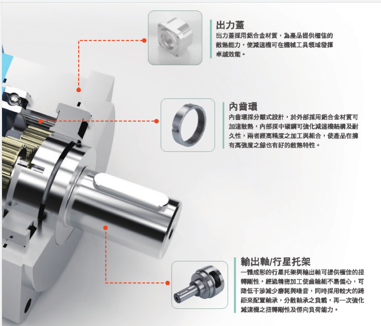 行星減速機的基本傳動結構分為太陽齒輪、行星齒輪、內齒輪環、連...