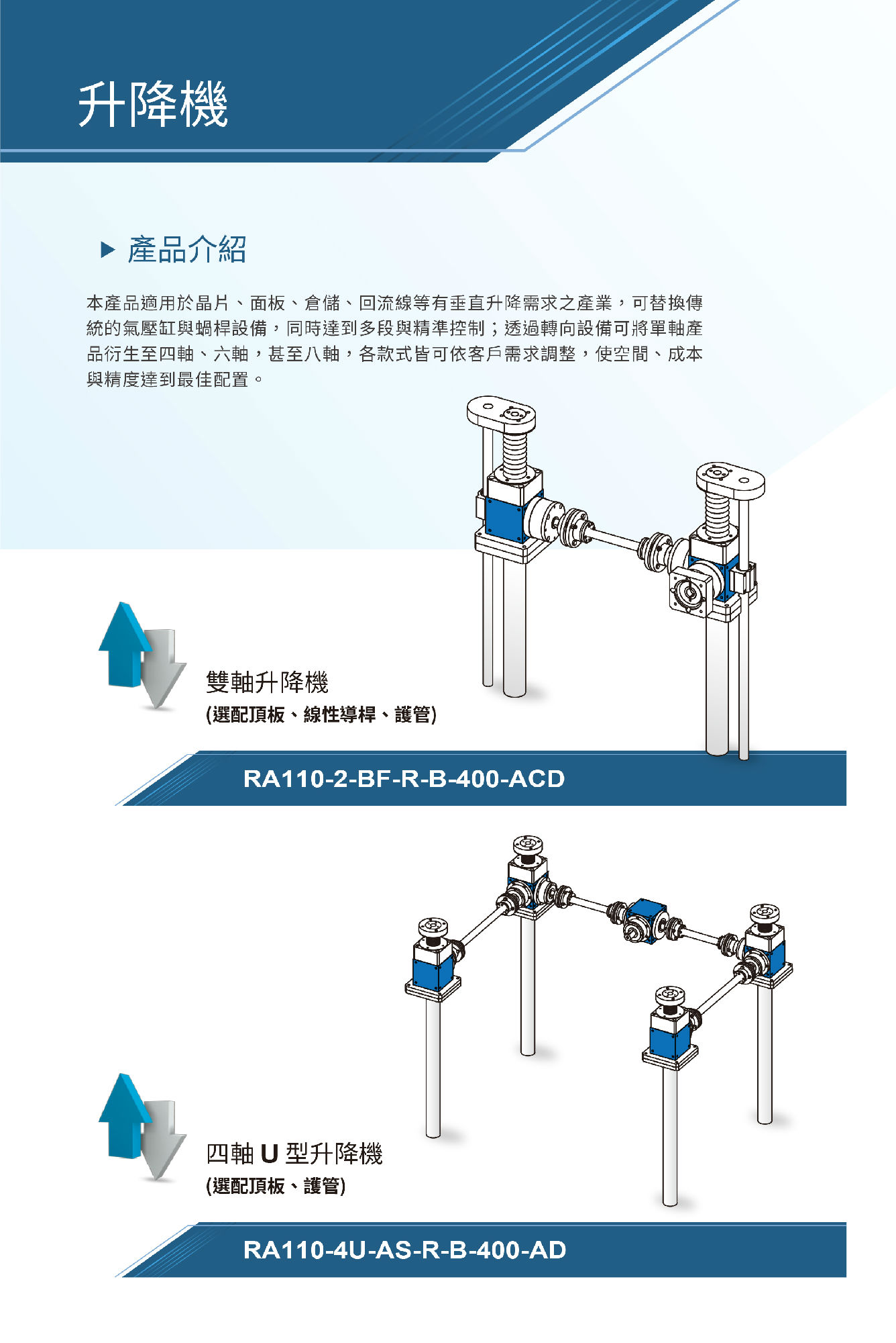 BF系列雙軸升降機(jī)可選配頂板,線性導(dǎo)桿,護(hù)管。適用于晶片、面板、倉儲、回流線等有垂直升降需求的產(chǎn)業(yè),可替換傳統(tǒng)的氣壓罐與蝸桿設(shè)備,同時達(dá)到多段與精準(zhǔn)控制。