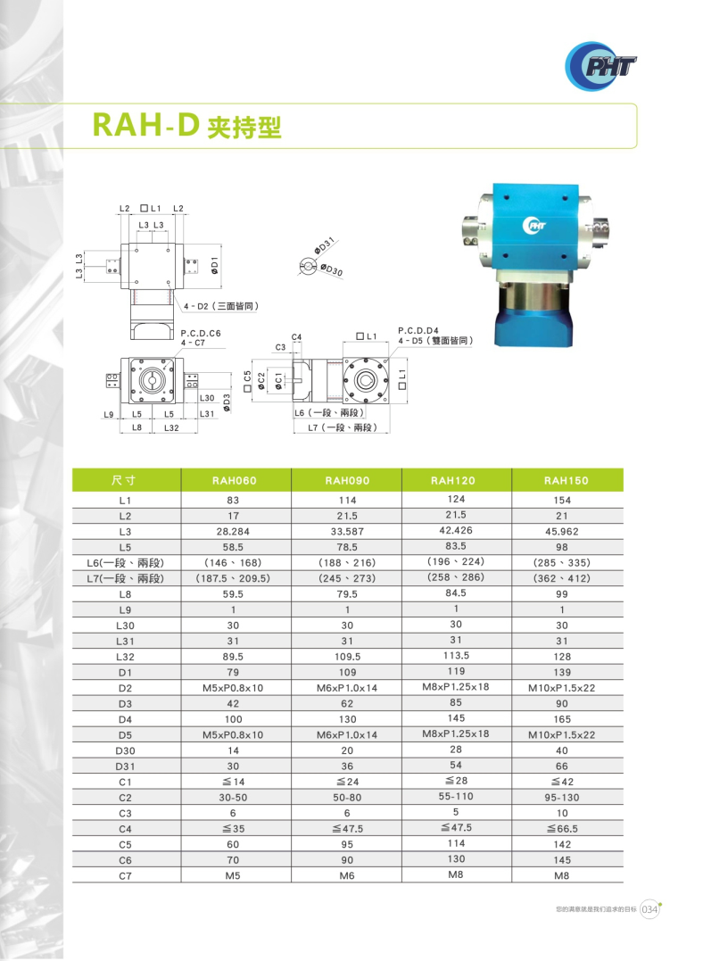 RAH-D系列是夾持型設(shè)計(jì)。 鋁合金材質(zhì)可提高散熱能力,減緩溫升現(xiàn)象造成影響。 多樣化的出力軸可因應(yīng)各種場合,客制化的入力端可搭配各式馬達(dá)。 提供各式特色之減速機(jī),供使用者依需求選購。 特殊油封設(shè)計(jì),正常使用下不需保養(yǎng)亦不用更換潤滑油,可延長使用壽命。 各式特色,體積小,省空間,噪音低,輸出扭矩高,安裝容易,可搭配馬達(dá)型號廣泛。 RAH搭配DM,一體成型的齒輪組,可有效的減低噪音。 RAH搭配DH,最佳的性價比,可廣泛應(yīng)用于各種場合。