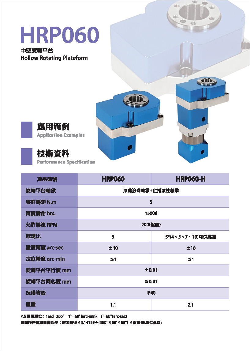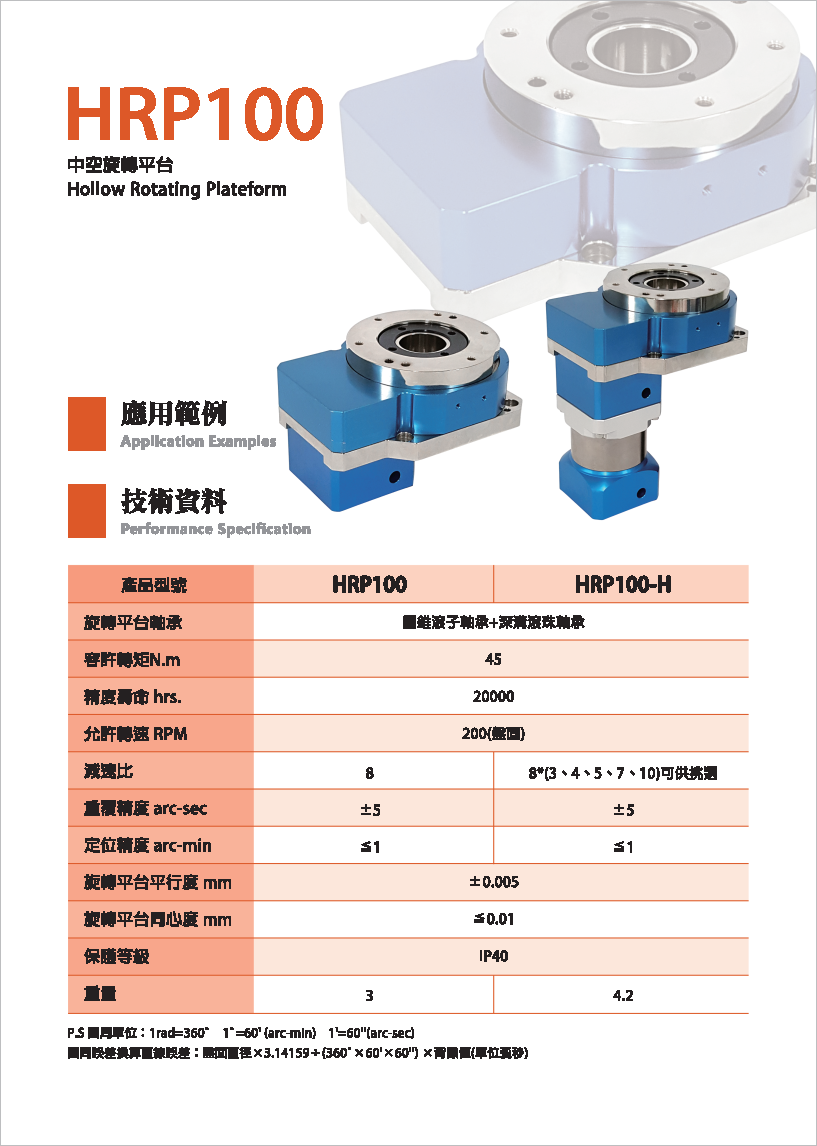 HRP系列是品宏轉角減速機系列。 可搭配伺服馬達或減速齒輪箱,提供使用者多種選擇。 工作平臺可直接與工件配合,提高便利性。 旋轉平臺為中空軸設計,適用于配管之場合。 定位精度小于1弧分,重復精度可達±5弧秒,增加產品之穩定性。 各式優點可讓產品應用層面更加廣泛。