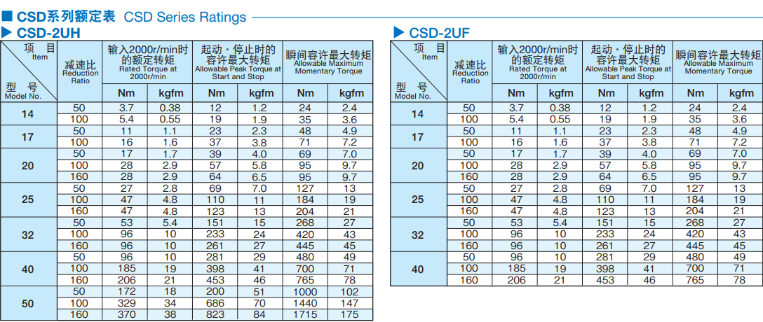 新型Harmonic Drive CSD系列順應市場要求實現(xiàn)了大膽創(chuàng)新的小型化。 CSD-2UH體積比轉(zhuǎn)矩容量相同的CSF系列更小。 CSD-2UF為中空結(jié)構(gòu),輸出側(cè)軸承的負載容量是SHD系列同型號的約2倍。 諧波發(fā)生器:橢圓形凸輪的外圈上嵌入薄型的滾珠軸承,整體呈一橢圓形狀的零件。軸承的內(nèi)圈固定于凸輪之上,外圈則介由滾珠彈性變形。一般安裝在輸入軸上。 柔輪:具有薄壁杯型的金屬彈性體的零件。杯的開口部外圈刻有齒形。柔輪的底部稱為膜,通常安裝到輸出軸上。 剛輪:剛性環(huán)狀的零件。內(nèi)側(cè)上刻有與柔輪同樣大小的齒形,且比柔輪多2個齒數(shù)。一般固定在外殼上。