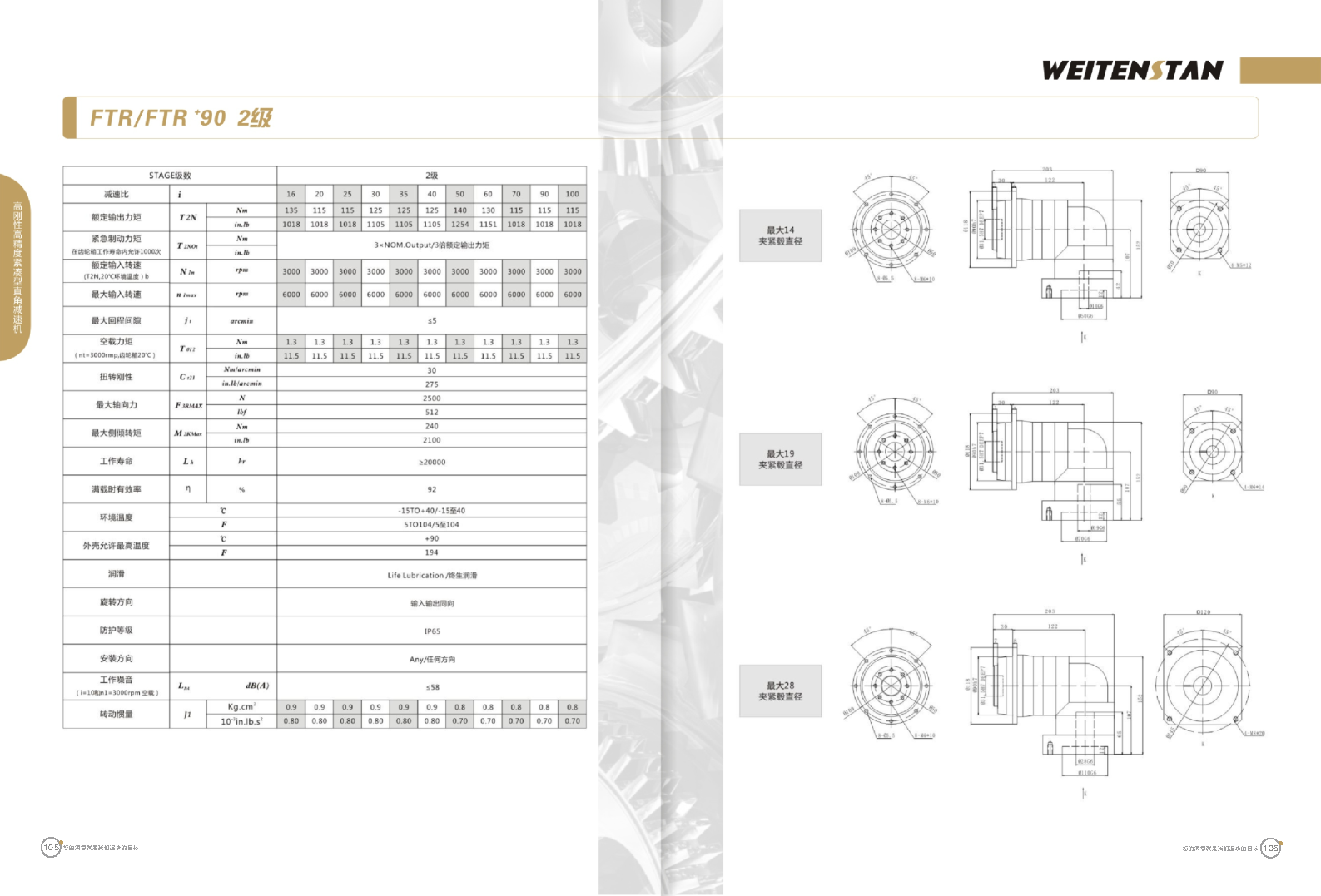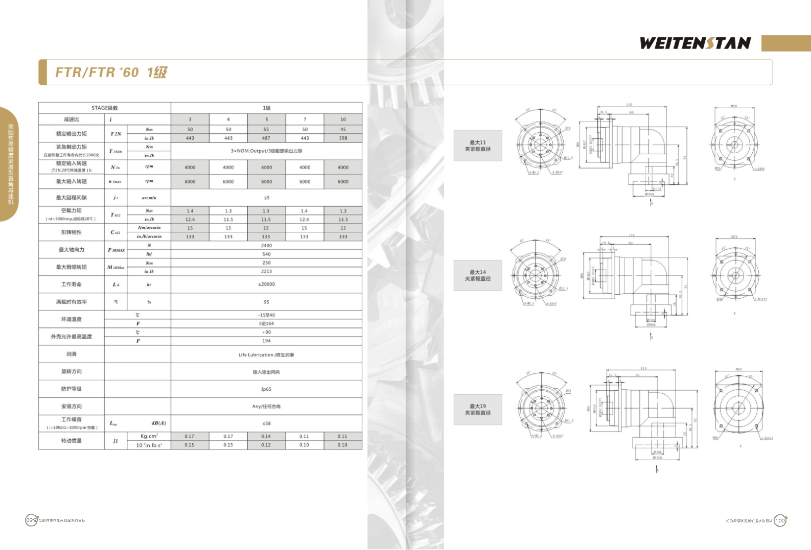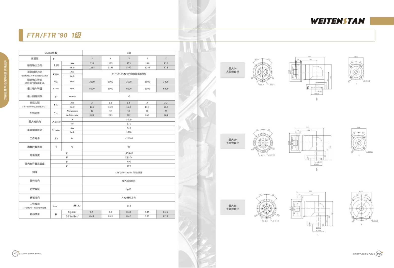 FTR系列高剛性高精度緊湊型直角減速機(jī)。 FTR產(chǎn)品系列的高精度高剛性轉(zhuǎn)角式減速機(jī)。緊湊的結(jié)構(gòu)型和簡單安裝方式。 極高的功率密度。盡管以往系列性能極為出色,但我們成功的將扭矩提高了近40%。不斷提高極限值,典型威騰斯坦產(chǎn)品! 電機(jī)安裝簡易。電機(jī)可安全簡易的一步安裝,另外您也可以選擇威騰斯坦享有的專利權(quán)的,帶有長度補(bǔ)償軸的安裝。 任意位置安裝。不管你在哪個(gè)位置安裝,你的齒輪箱始終有相同的潤滑油/潤滑脂量。安裝靈活、齒輪箱能夠垂直、水平、與從動(dòng)軸一起向上或向下安裝。 極高的定位精度。根據(jù)用戶需求,你可獲得回程間隙小于角分的高型行星齒輪箱。這也大大提高了你應(yīng)用上的定位精度。 通過齒輪嚙合,運(yùn)轉(zhuǎn)平穩(wěn)。相比直齒嚙合齒輪箱,本公司的斜齒嚙合齒輪箱運(yùn)轉(zhuǎn)噪音減低了50dB-A,你深知50dB-A所創(chuàng)造的價(jià)值遠(yuǎn)遠(yuǎn)高于70dB-A。此外還有:不再感動(dòng)振動(dòng),運(yùn)轉(zhuǎn)平穩(wěn)到令人驚訝。 世界水平的預(yù)期壽命。原材料進(jìn)行了優(yōu)化,幾何形狀同樣進(jìn)行了優(yōu)化。