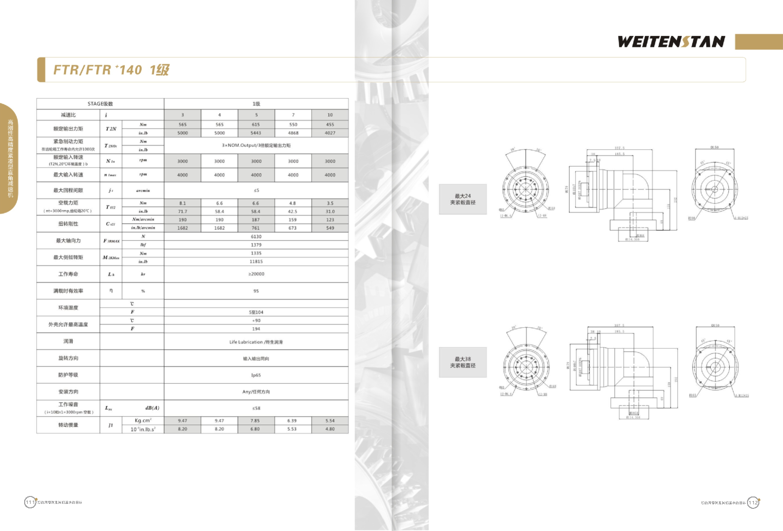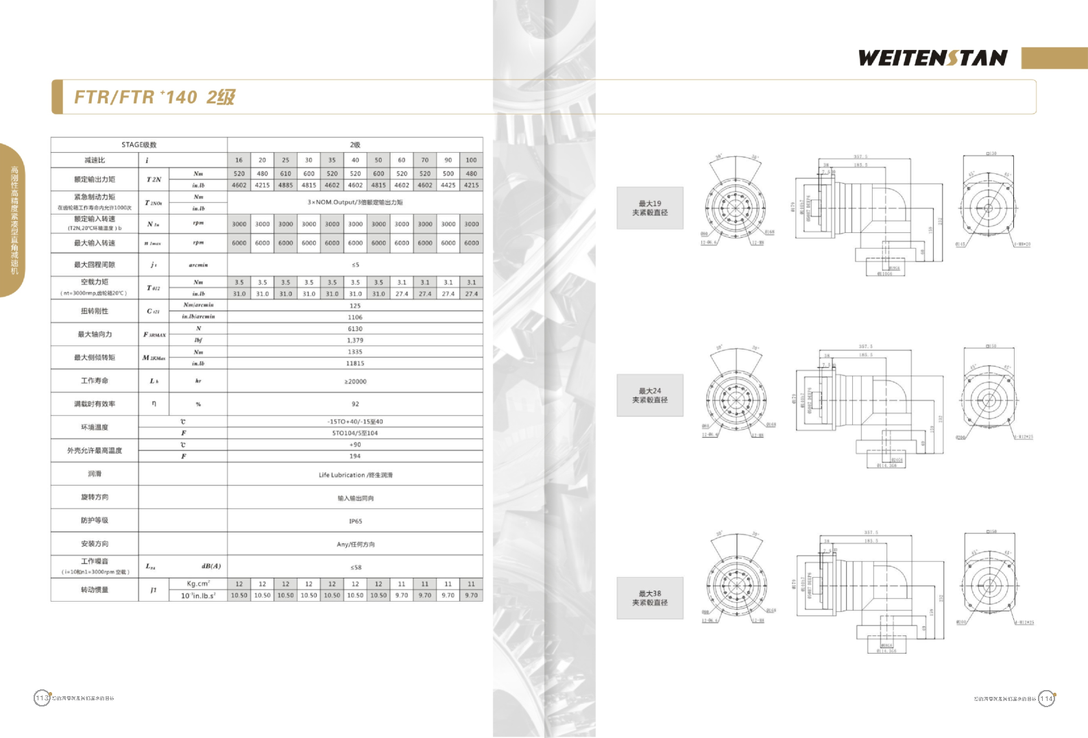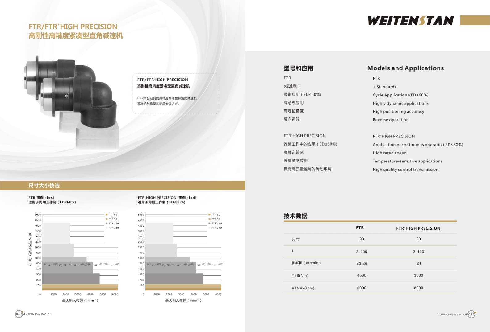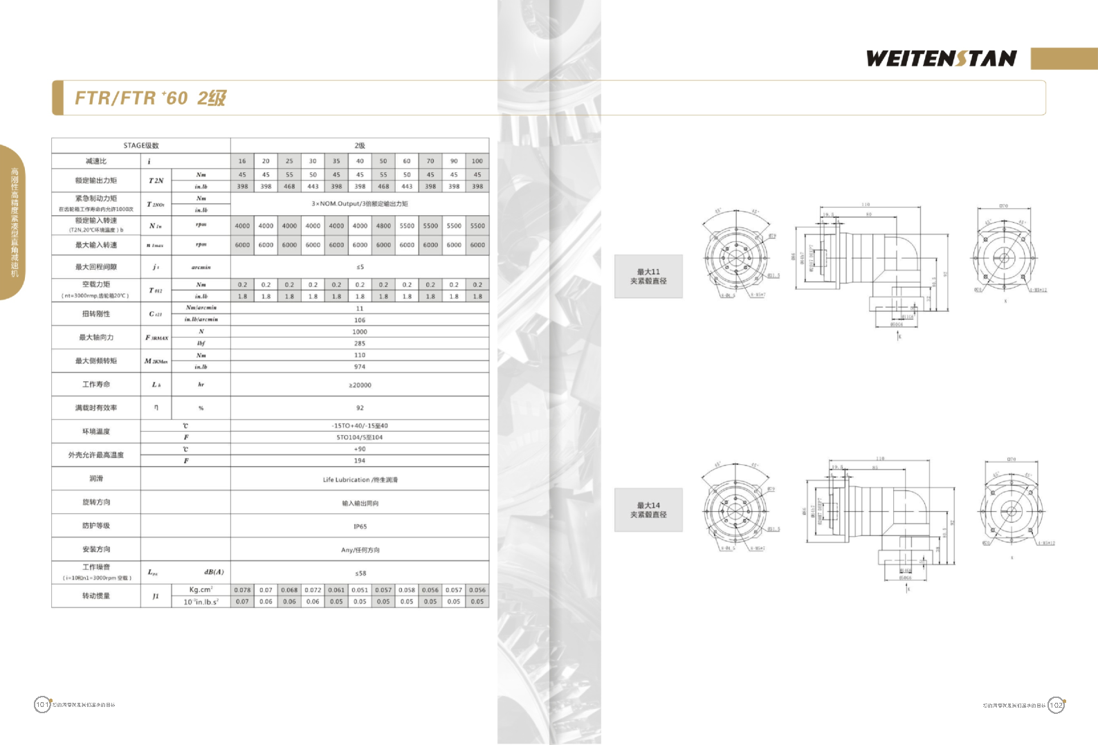 FTR系列高剛性高精度緊湊型直角減速機(jī)。 FTR產(chǎn)品系列的高精度高剛性轉(zhuǎn)角式減速機(jī)。緊湊的結(jié)構(gòu)型和簡單安裝方式。 極高的功率密度。盡管以往系列性能極為出色,但我們成功的將扭矩提高了近40%。不斷提高極限值,典型威騰斯坦產(chǎn)品! 電機(jī)安裝簡易。電機(jī)可安全簡易的一步安裝,另外您也可以選擇威騰斯坦享有的專利權(quán)的,帶有長度補(bǔ)償軸的安裝。 任意位置安裝。不管你在哪個(gè)位置安裝,你的齒輪箱始終有相同的潤滑油/潤滑脂量。安裝靈活、齒輪箱能夠垂直、水平、與從動(dòng)軸一起向上或向下安裝。 極高的定位精度。根據(jù)用戶需求,你可獲得回程間隙小于角分的高型行星齒輪箱。這也大大提高了你應(yīng)用上的定位精度。 通過齒輪嚙合,運(yùn)轉(zhuǎn)平穩(wěn)。相比直齒嚙合齒輪箱,本公司的斜齒嚙合齒輪箱運(yùn)轉(zhuǎn)噪音減低了50dB-A,你深知50dB-A所創(chuàng)造的價(jià)值遠(yuǎn)遠(yuǎn)高于70dB-A。此外還有:不再感動(dòng)振動(dòng),運(yùn)轉(zhuǎn)平穩(wěn)到令人驚訝。 世界水平的預(yù)期壽命。原材料進(jìn)行了優(yōu)化,幾何形狀同樣進(jìn)行了優(yōu)化。