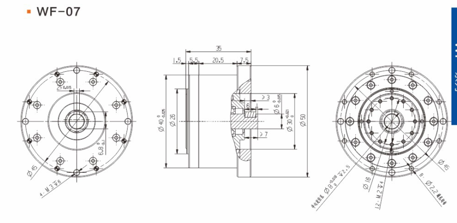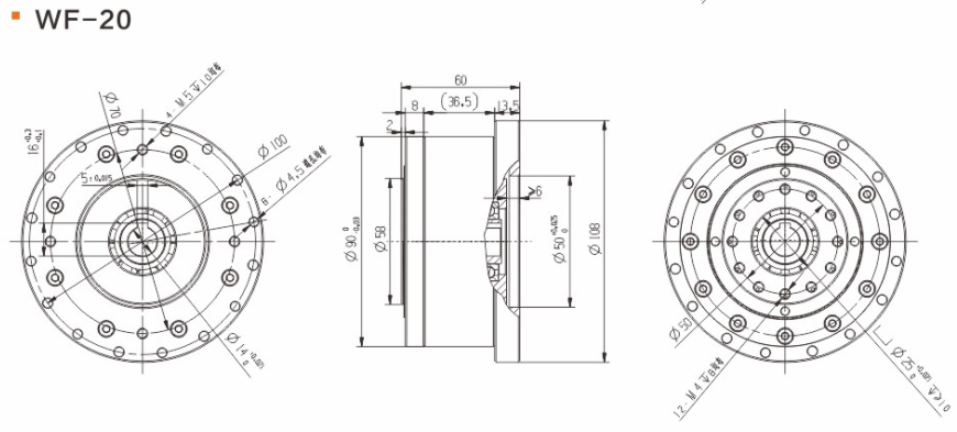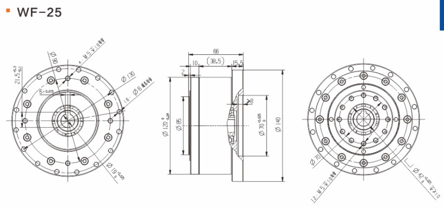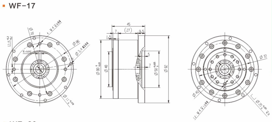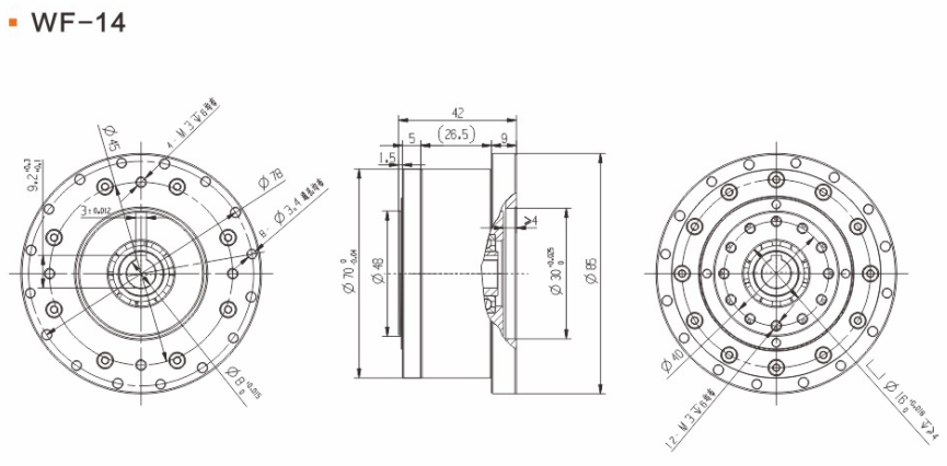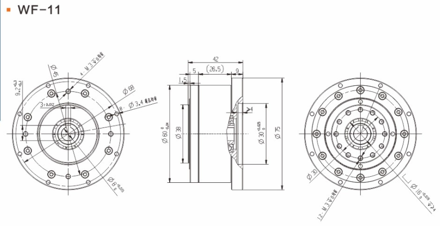 具有傳動效率高、工作平穩、噪聲低、結構緊湊、重量輕、體積小、使用可靠、壽命長、減速比范圍大等優點。 輕量流線型設計、鋼質本體、機型輕薄短小、體積比傳統行星式減速器大幅縮小、可節省安裝空間。 真圓齒形、齒腹大、抗壓性強、不干涉不崩齒、可承受頻繁正逆轉和瞬間急停慣性沖擊。 雙排結構、負載分散、機理平衡、圓形齒輪設計、磨損小、噪音和溫升要比其他減速器低。 線接觸傳動、摩擦系數小、效率高、出力扭矩大、慣量低、是一種精密的剛性傳動,剛性傳動軌跡也最接近理想工作曲線,這和部分原件使用滾動件的擺線式或和諧式傳動設計有些許不同。 由于雙共軛工作曲線和撓性軸銷輸出裝置的改良設計、本機高精度背隙可控制在弧秒范圍。 長效性油脂潤滑、不需要保養、安裝方向不受限。 人力方式有筒夾緊式和鍵槽式供選用。